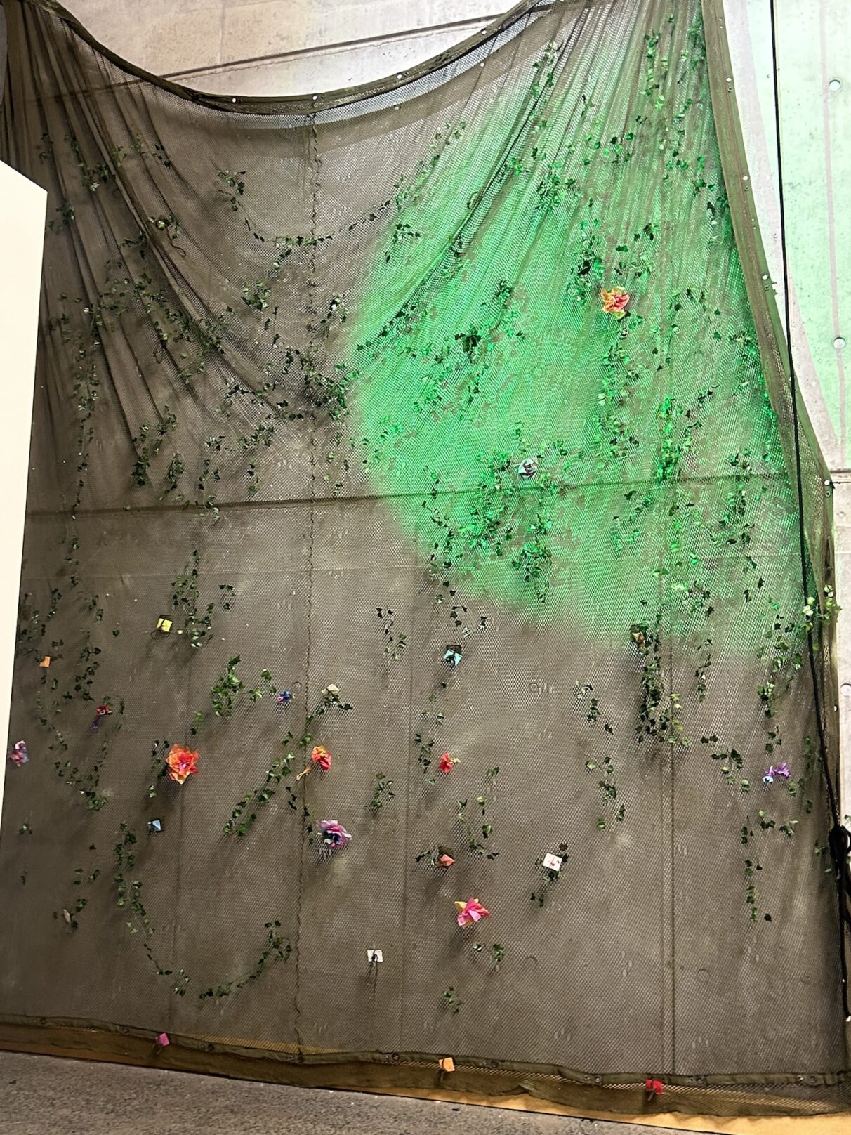 The wall features a floor-to-ceiling net, interwoven with flowers made by patrons out of tissue paper, and small origami envelopes. Attendees are encouraged to take home envelopes.