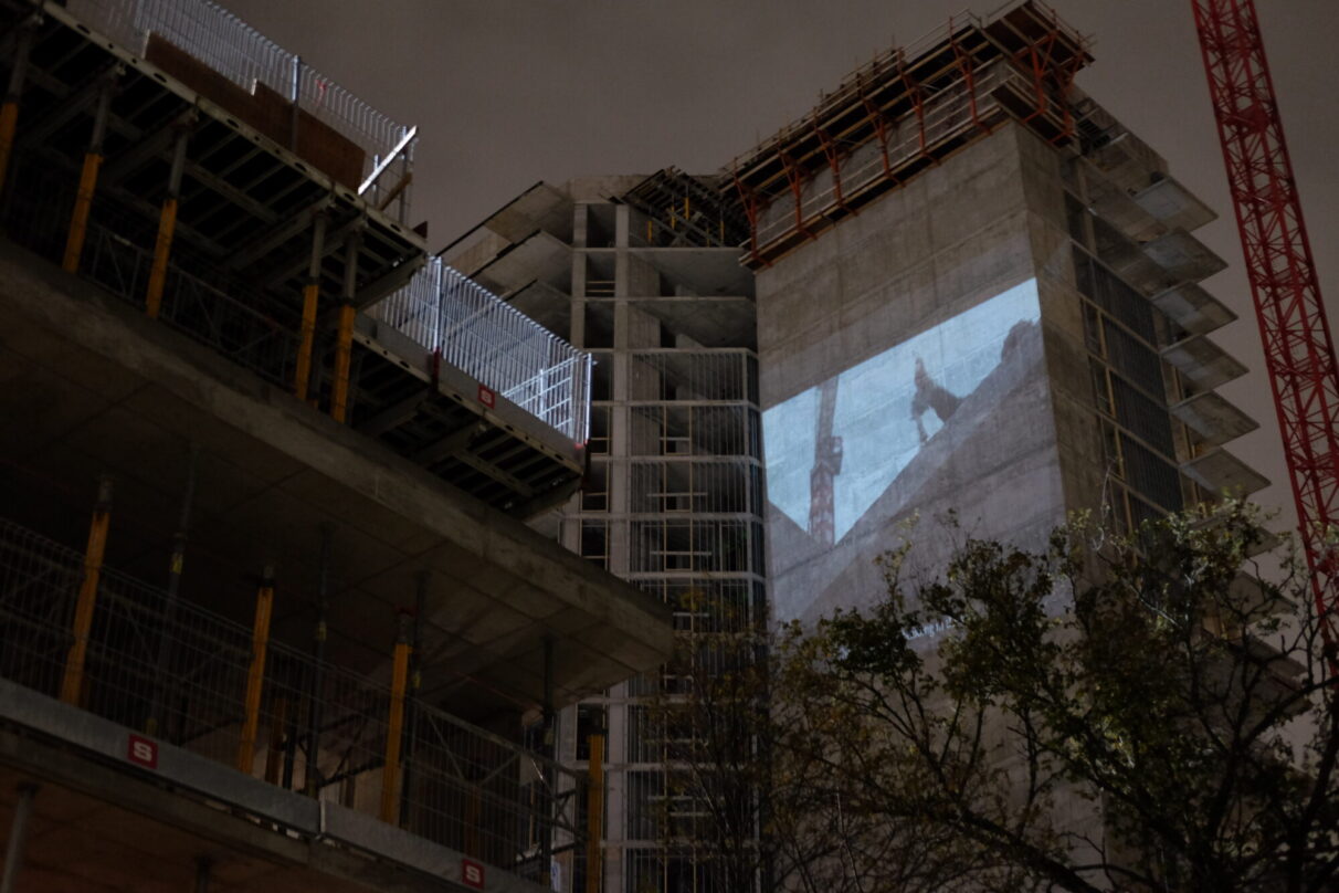 (Ella Tsang/The Signal)Emma Chapman-Lin and Charlie MacLean’s Real Estate Agent vs. the Angel of History is projected in the Bus Stop Theatre parking lot, on the blank wall of a property development.