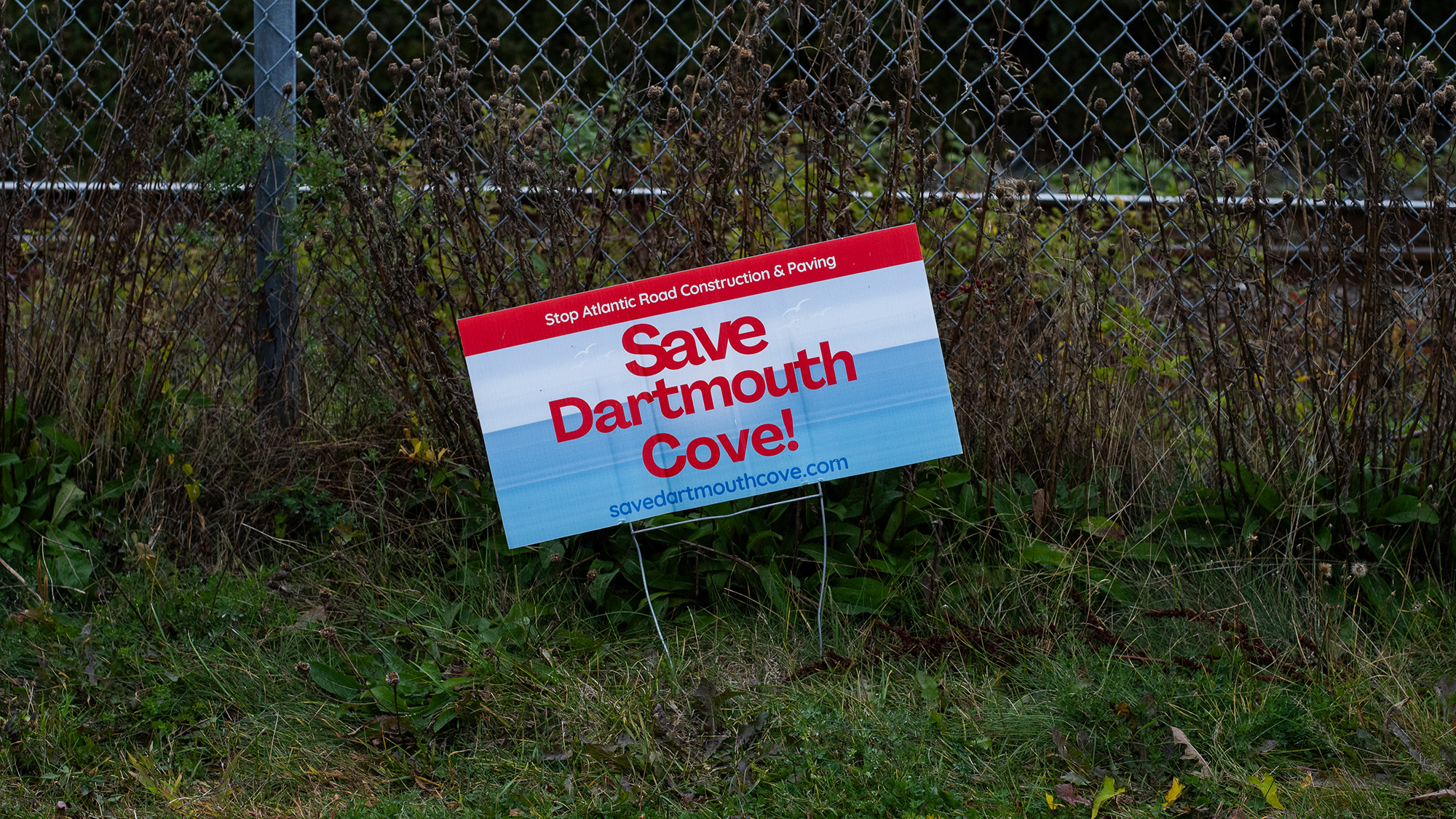 A sign by Save The Dartmouth Cove, an organization against the filling and construction proposed for Dartmouth cove, is posted near a trail bordering the site.The province will review a controversial Halifax Regional Municipality bylaw that prohibits infilling activities in Dartmouth Cove.