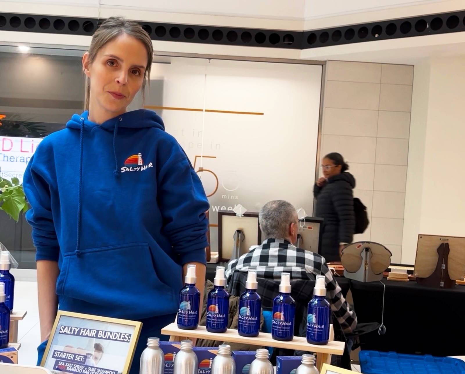 Salty Hair co-founder Allison Petrosoniak poses for a photo at her booth in Park Lane Mall. Salty Hair that sells products meant to give your hair the beach wave effect it has when you walk out of the ocean.Along the aisles of Park Lane Mall on a Thursday evening earlier this month were 35 local vendors whose creativity brought the Halifax community together.