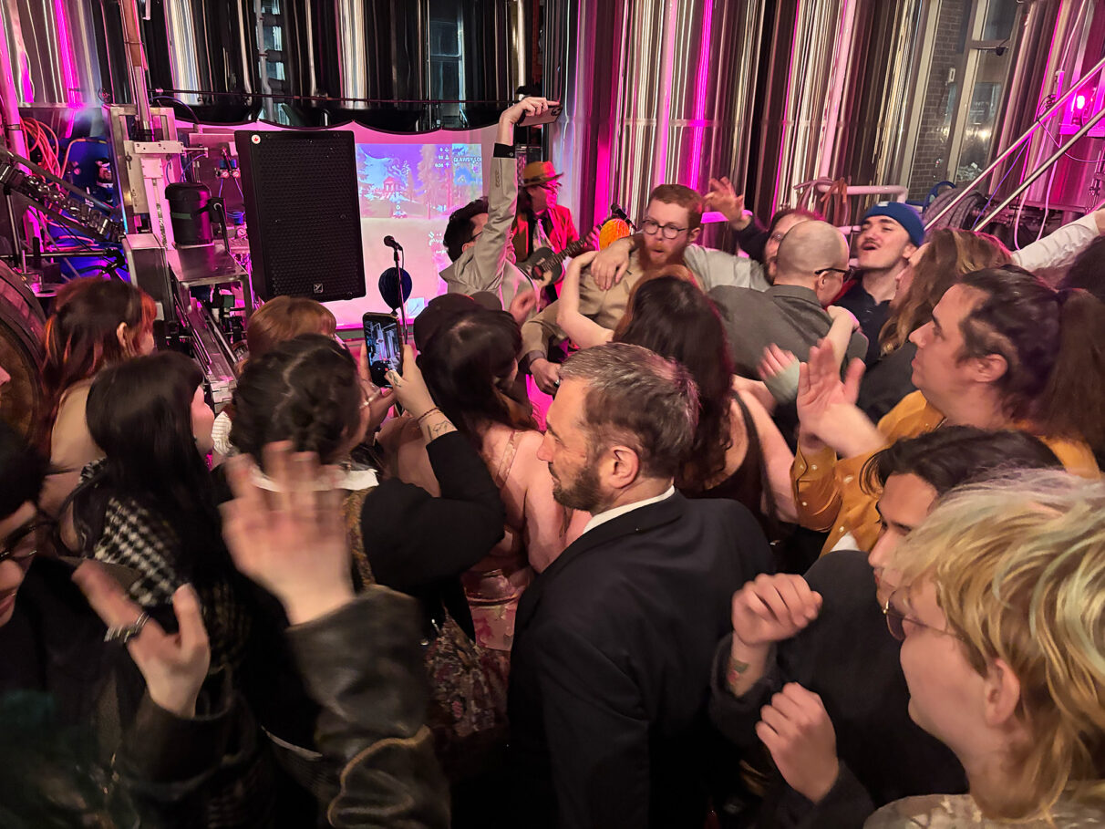Noah Tye plays for a crowd of dancing people to end the open mic night at 2 Crows Brewery in Halifax on March 2. The audience is celebrating the sixth anniversary of Noah Tye’s Open Song Circle.The night consisted of 50 performances and ran till midnight. Tye thanks the crowd and closes out the night with his own performance, and attendees swarm the open space in front of him to dance together.