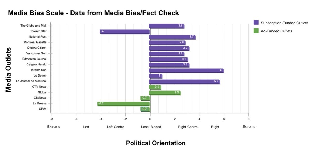 The Signal examined 16 of Canada’s top media outlets — classifying them by one of two funding models: subscription-funded and ad-funded — to examine whether an outlet’s funding model affects its editorial bias. The Signal defined subscription-funded outlets as those that derived any revenue from subscriptions. Most subscription-funded outlets still generate some revenue from advertising.