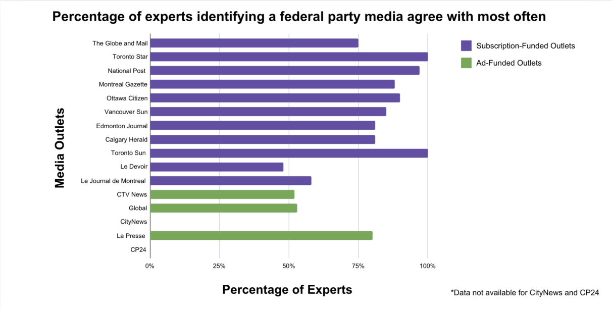Subscription-funded media outlets were more likely than ad-funded outlets to often agree with one of the federal political parties, according to a 2020 Université de Montréal study that surveyed 200 Canadian journalism, communication and political science professors.