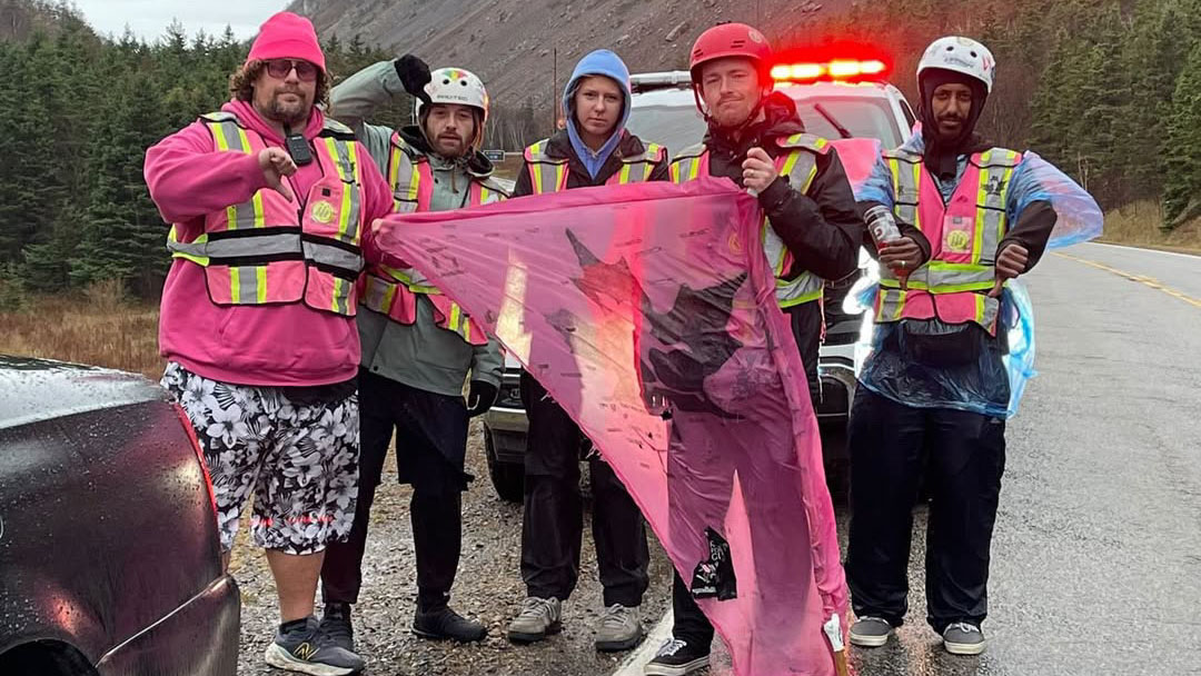 Bricin Striker Lyons (far left) and crew hold a Push for a Cure flag in front of a Parks Canada vehicle.Cameron Brow, one of the ride’s participants, expects to be called to court. Brow said that parks law enforcement told them they could be facing charges and a fine of up to $25,000.