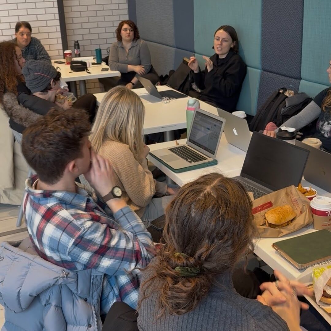 Students in the news workshop attend a morning meeting with instructor Caora McKenna, at left, at the Halifax Shopping Centre food court on Feb. 2.Over the past six weeks, students in the news workshop at the University of King’s College worked together to research, crunch data, report, photograph and share information about the 20 pedestrian fatalities on Halifax streets from 2018-25.