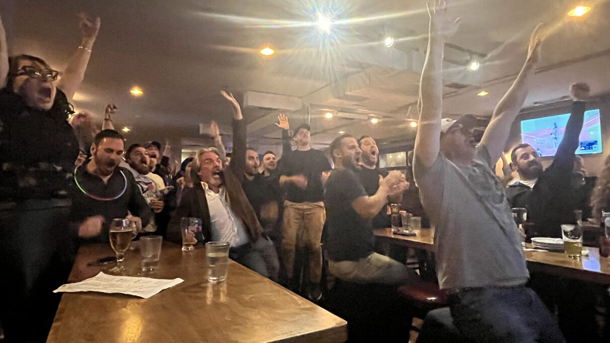 Fans celebrate Isiah Kiner-Falefa’s run during Game 7 at the Beaver’s Den in Halifax before he was deemed out at the plate. Had he made it, the Blue Jays would have won the World Series.  Isabel Duque
