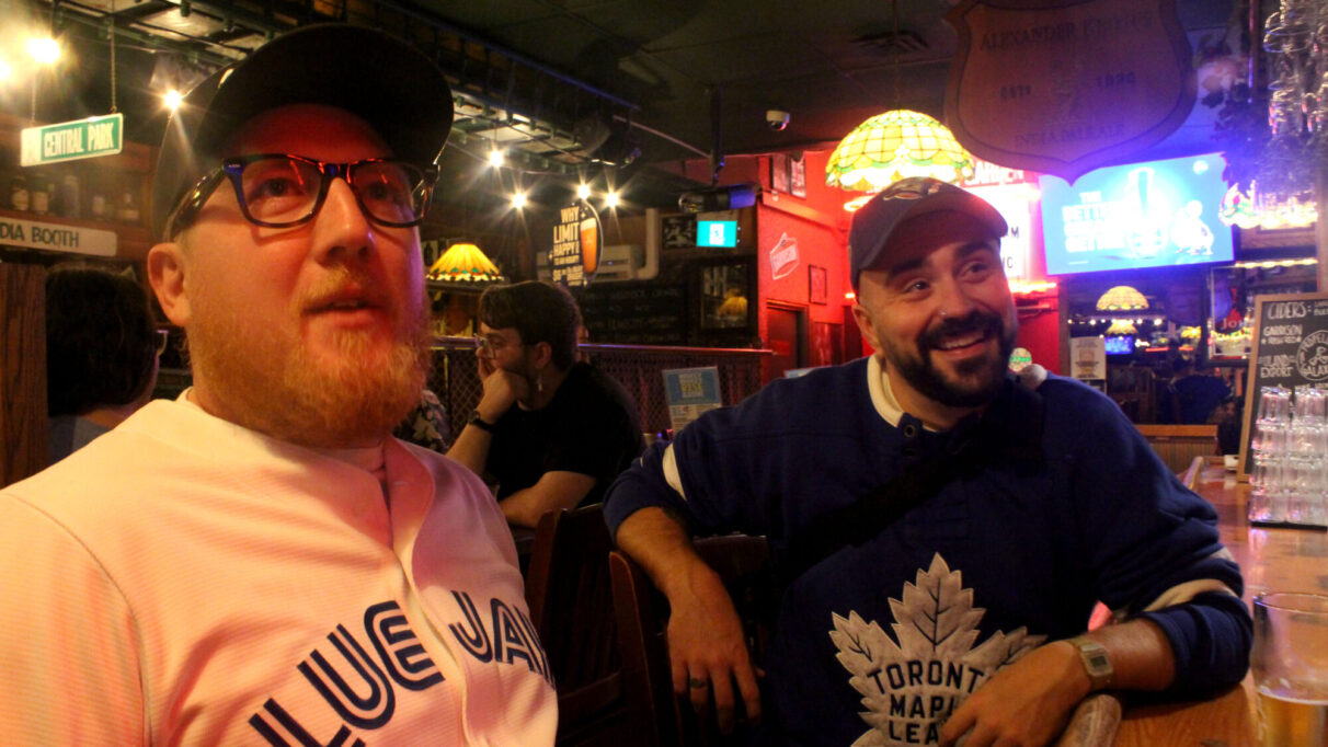 Isaac Watters (right) wears a hat designed to resemble a bird’s beak at Charlie’s Club. He predicted the Blue Jays would win Game 6 with a no-hitter.  Daniel Salas
