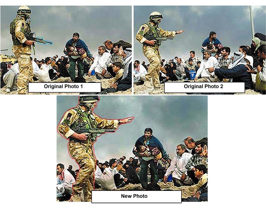 The two photos Brian Walski edited together, compared to the composite published by the L.A. Times.Adnan Hajj, a freelance photographer working for Reuters, used Photoshop to digitally alter a photo of the aftermath of an attack in Beirut during the 2006 Lebanon war, adding and darkening smoke to make the damage appear worse than it was.