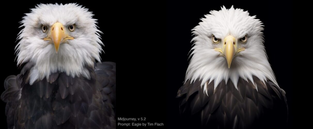 Left: A portrait of a bald eagle taken by Tim Flach for his 2021 book Birds. Right: A portrait of a bald eagle by AI image generator Midjourney using the prompt “Eagle by Tim Flach.”In addition to making his photos harder for AI to copy, Flach has also embedded QR codes into his new photography book Feline, which, when scanned, reveal behind-the-scenes videos and narration from Flach himself, adding an air of authenticity to the photo. The safeguards are important, Flach said in an interview, amid the changing technology.