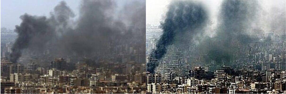 Left: Adnan Hajj’s original photo showcasing the aftermath of an attack in Beirut. Right: Adnan Hajj’s edited photo of the aftermath of an attack in Beirut. The smoke has been digitally-altered to appear darker, exaggerating the amount of smoke from the original photo.Later, Hajj was also found to have edited a photo of an Israeli fighter jet, cloning one singular flare into three that he misidentified as missiles. This resulted in Reuters parting ways with Hajj and pulling all of his photos from their site.