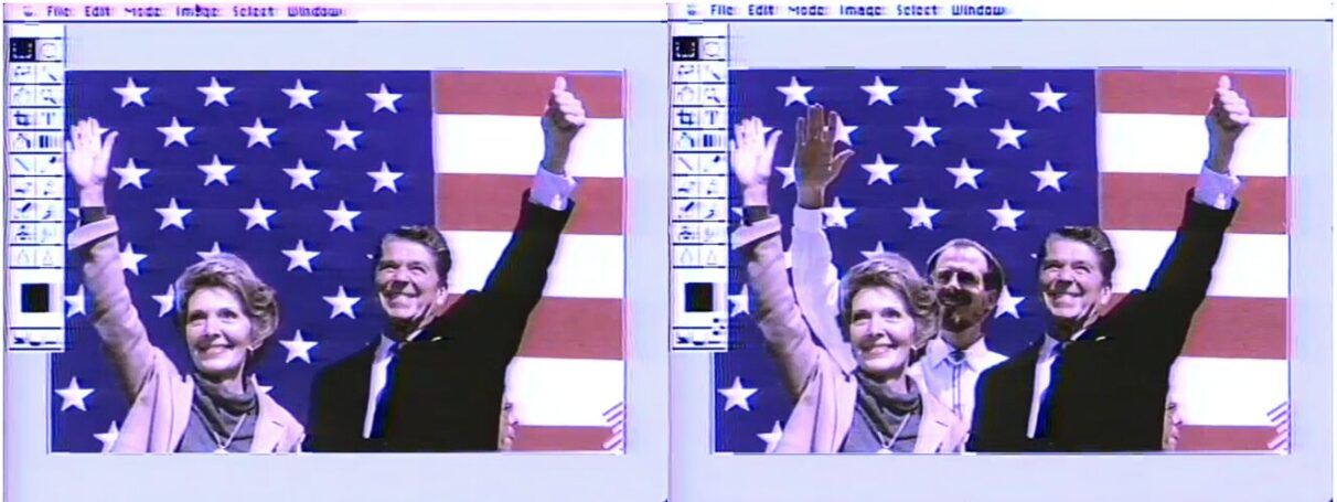 Beside the host sits Russell Preston Brown, senior art director of Adobe Systems, as he fiddles with a Macintosh II computer and uses Photoshop 1.0 to insert an image of himself into a photo with ex-president Ronald Reagan and first lady Nancy Reagan, the three of them now joined in a celebratory salute in front of the American flag. Brown, while asserting that he uses the tool ethically in his professional life, acknowledges his TV demonstration is a “most unethical situation.”